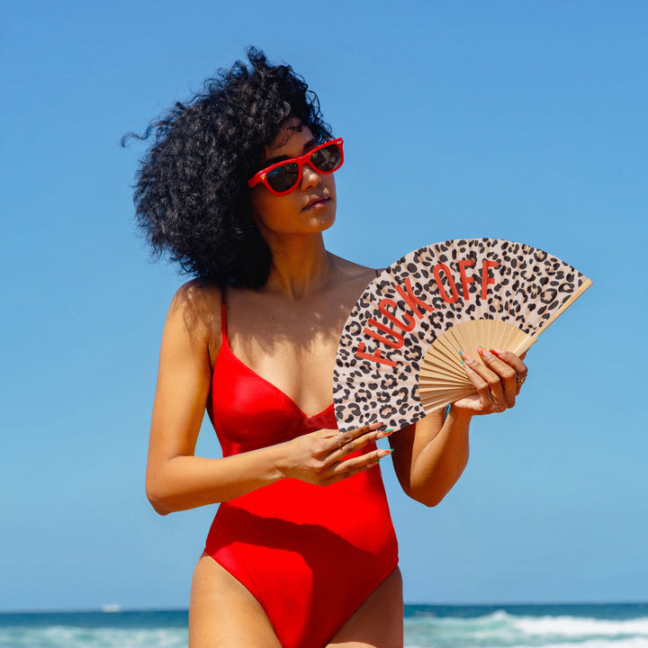 Con su estampado de leopardo 🐆 y sus letras rojas es perfecto para darle a tus “looks" veraniegos un toque de cañero. Además, incluye un práctico colgador para que puedas tenerlo siempre a mano y que no se te pierda ni se te olvide. ¡Cuélgatelo y olvídate de rebuscarlo en tu bolso o mochila 🎒 cuando necesites abanicarte!