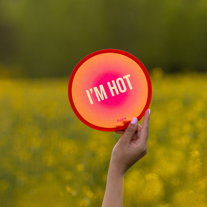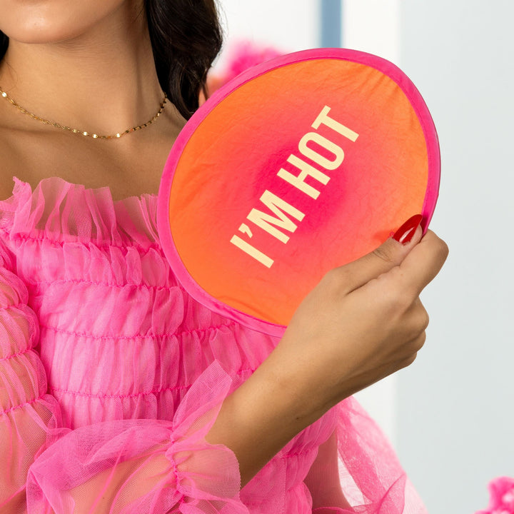 Ponle cara a las altas temperaturas y sumérgete en la belleza de un amanecer 🌅 con este abanico original en tonos rosa y naranja, que evocan los colores del inicio del día y su forma redonda como el sol. Además, con su mensaje “I’m hot” dejarás claro que tienes un calorazo que poco más y te derrites.