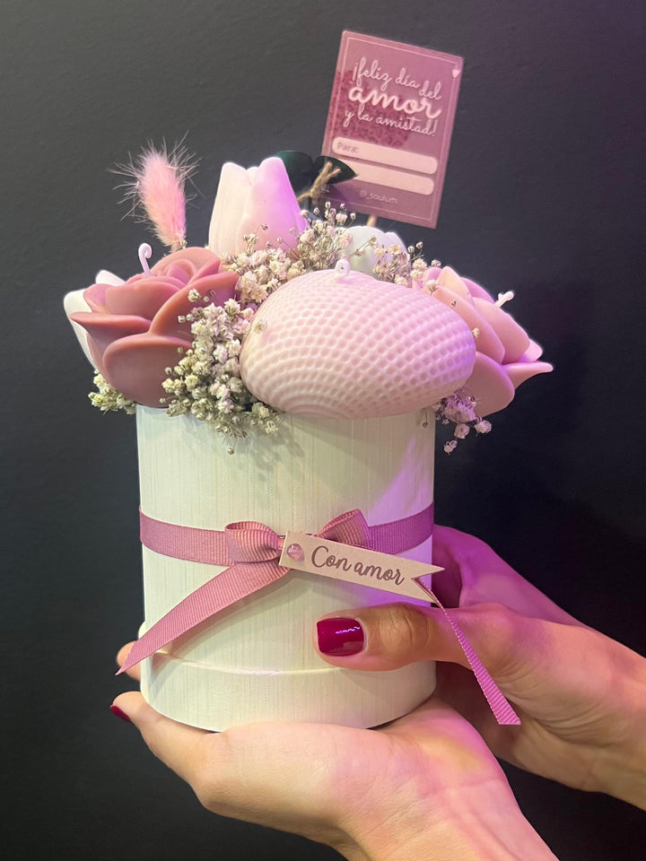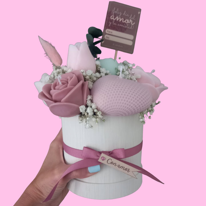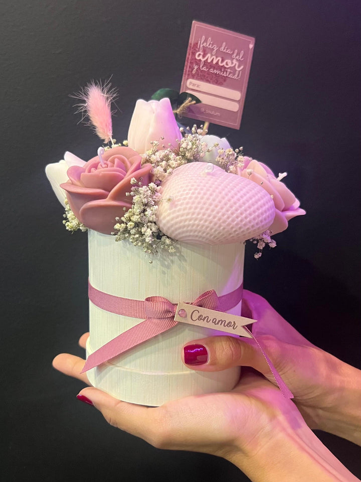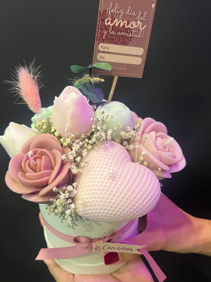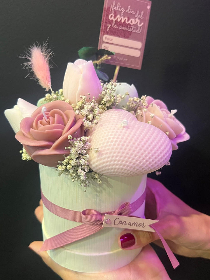 Hermoso bouquet mixto con rosas, tulipanes y corazón, todos elaborados en cera vegetal y caja de cartón blanca, un detalle que nunca se marchita, ideales para regalar en momentos especiales.