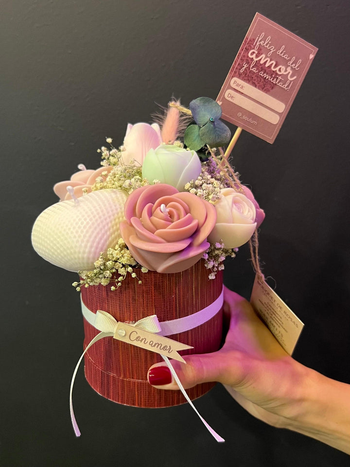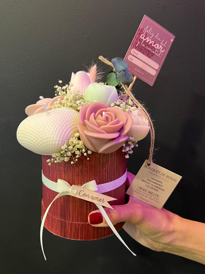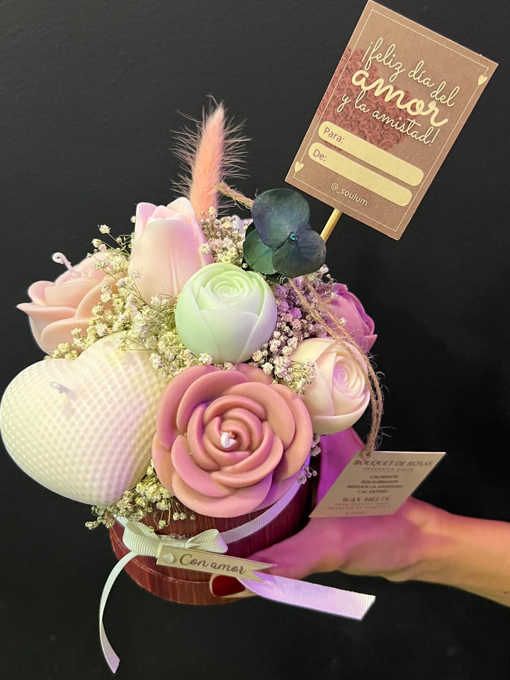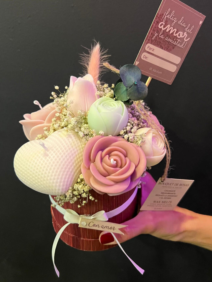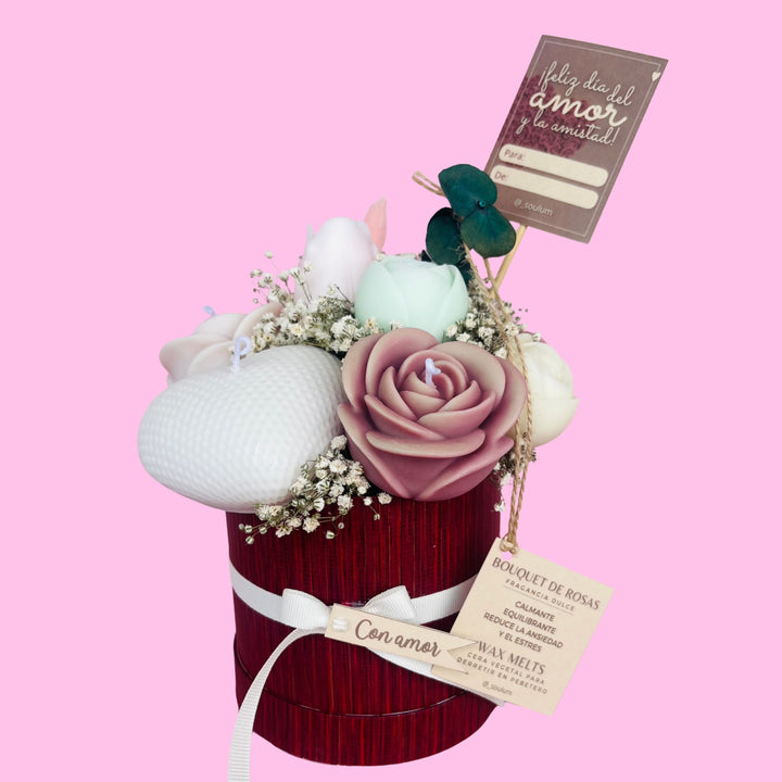 Hermoso bouquet mixto con rosas, tulipanes y corazón, todos elaborados en cera vegetal y caja de cartón roja, un detalle que nunca se marchita, ideales para regalar en momentos especiales.