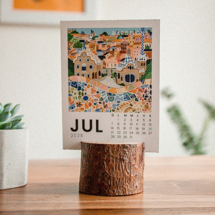 • Mini calendario de escritorio 2026 con soporte en tronquito de madera