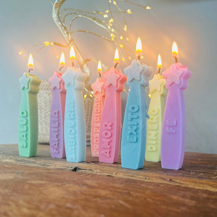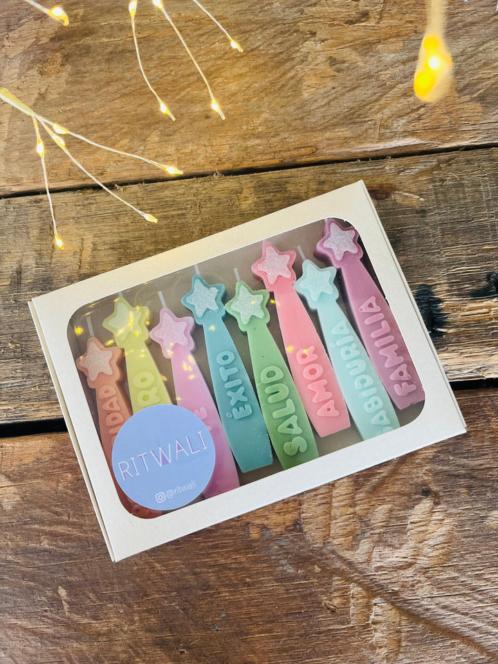 Contiene 8 velas elaboradas en colores pasteles en cera vegetal.
